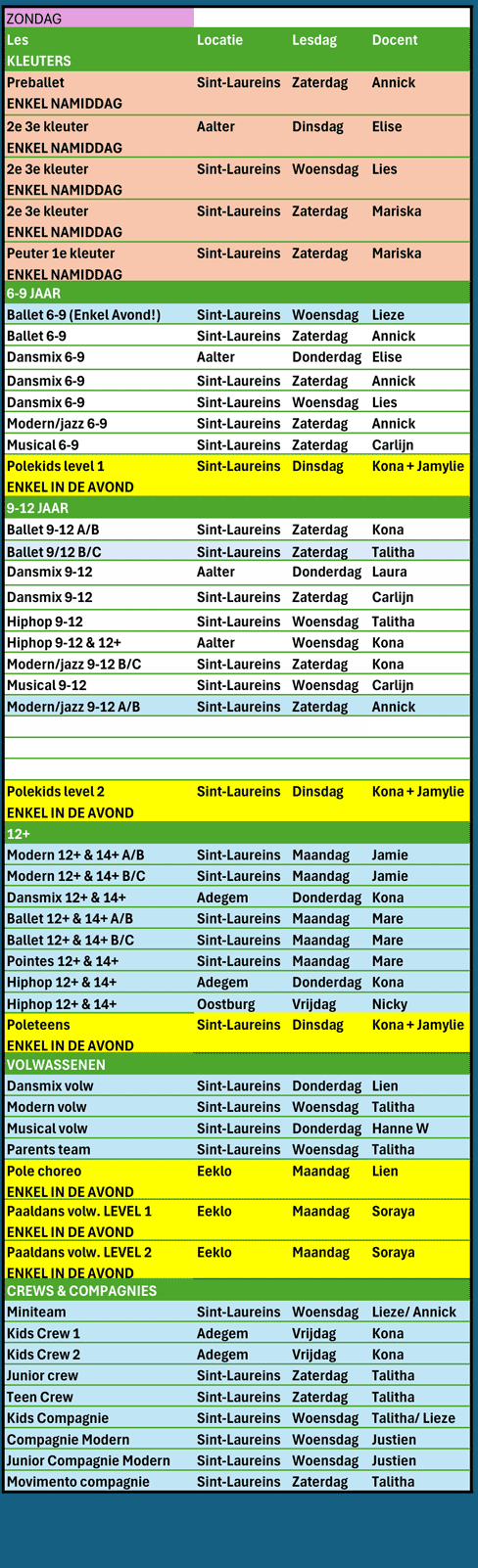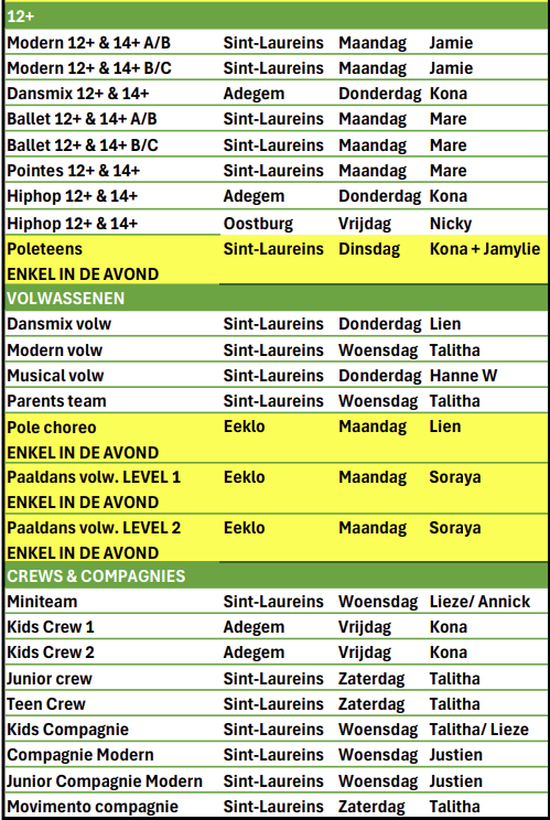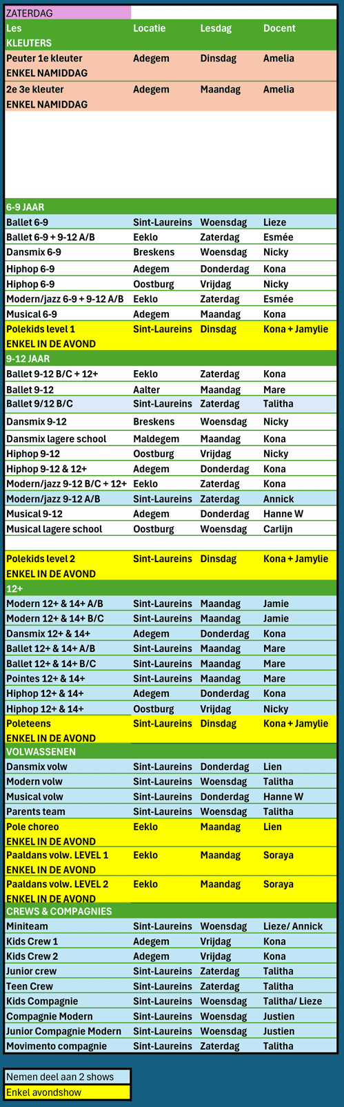 Alle 12+ groepen en volwassenen nemen deel op zaterdag en zondag met uitzondering van paaldans alleen in de avondshows.