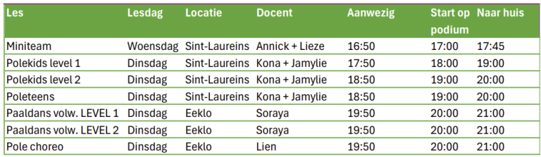 - 18:00 Verzamelen in de kleedkamer (paaldansers aanwezig)