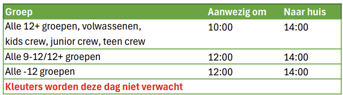 Alle groepen show A (zaterdag): 10u00-13u30 = 3,5 uur, aanwezig om 9u30