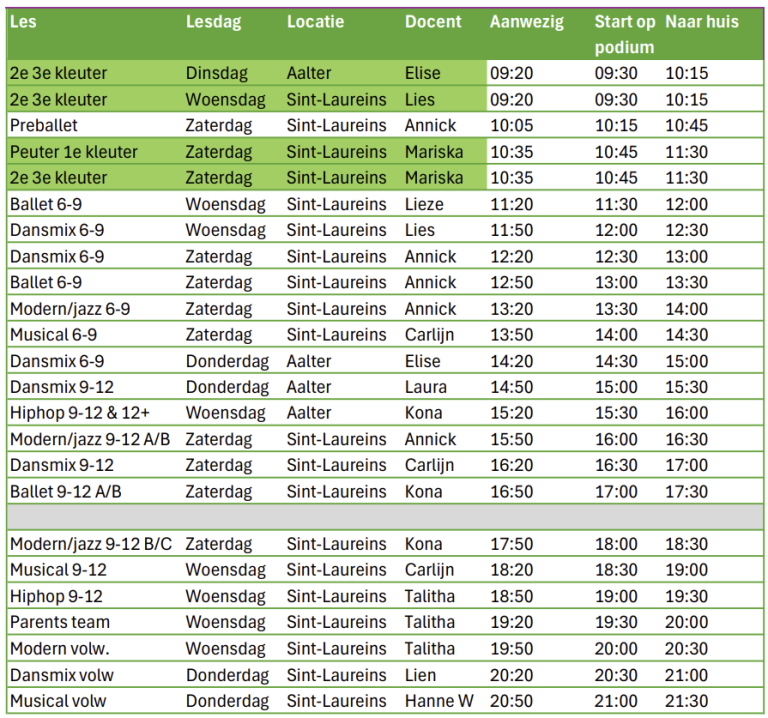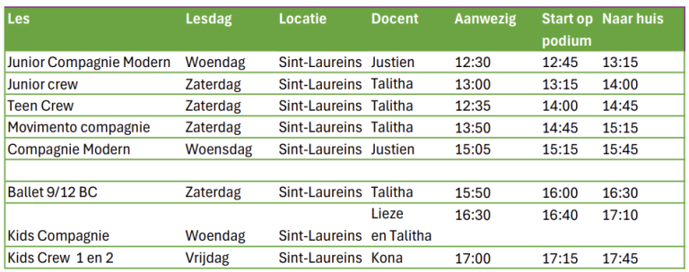 Bovenstaande informatie kan je hieronder nalezen. Aan de hand van bovenstaande punten bekijk je of de danser kan deelnemen of niet en bevestig je aan- of afwezigheid voor !datum!