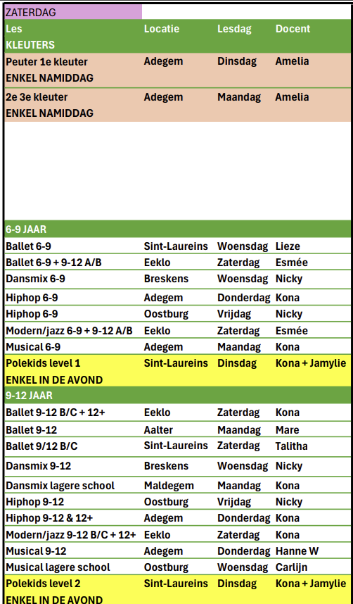Met uitzondering van de peuter- en kleutergroepen, deze groepen dansen alleen in de middagshows.