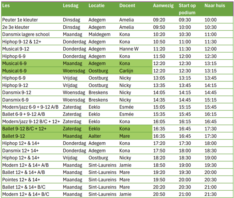 Alle crew/compagnie dansers moeten zowel op zaterdag als zondag van het showweekend aanwezig zijn: zij dansen 4 shows!